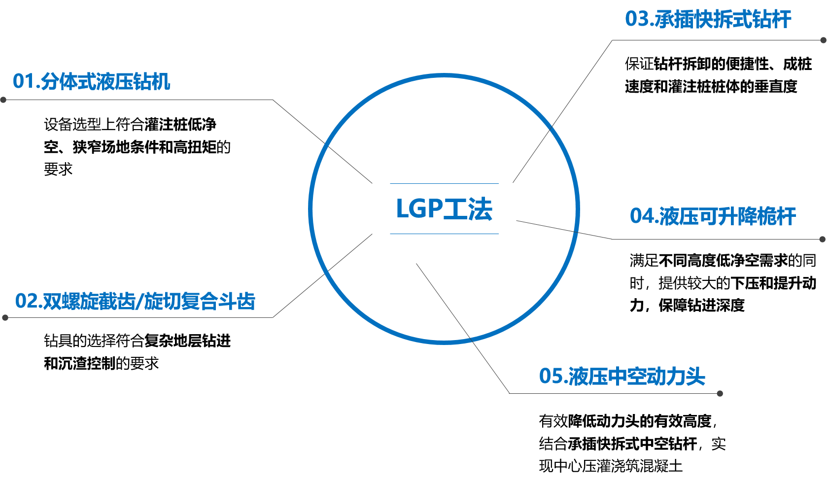 針對應用過程中的痛難點,項目團隊進行了配套研發和工藝升級,形成基于“五大關鍵技術+六大關鍵工序”的低凈空中心壓灌灌注樁(LGP)施工工法體系。