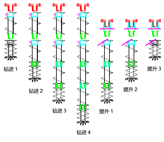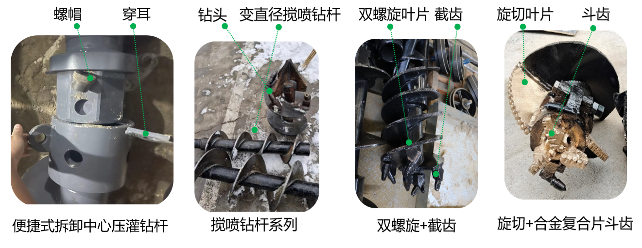 鉆頭改進設計:雙螺旋+截齒鉆頭有效解決砂層鉆進掉土難題,旋切+斗齒鉆頭在硬質黏土、三合土、小卵石中顯示出強大的切削鉆進能力。
