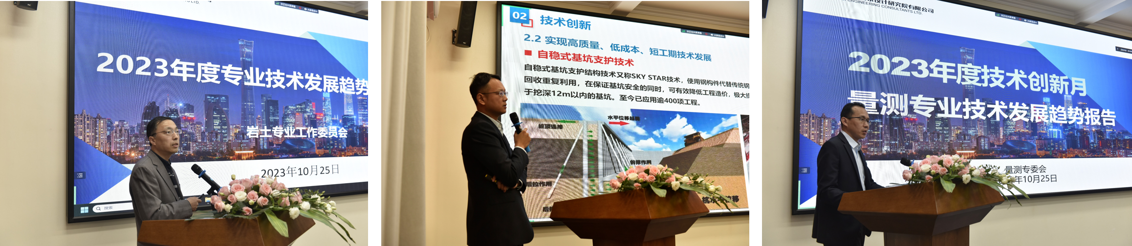 副總工程師韓煊、周子舟、劉長青分別代表院巖土、施工、量測專業工作委員會作各專業發展趨勢分析報告,總結行業最新技術發展動態,分析專業發展方向,并提出北勘院技術發展建議。