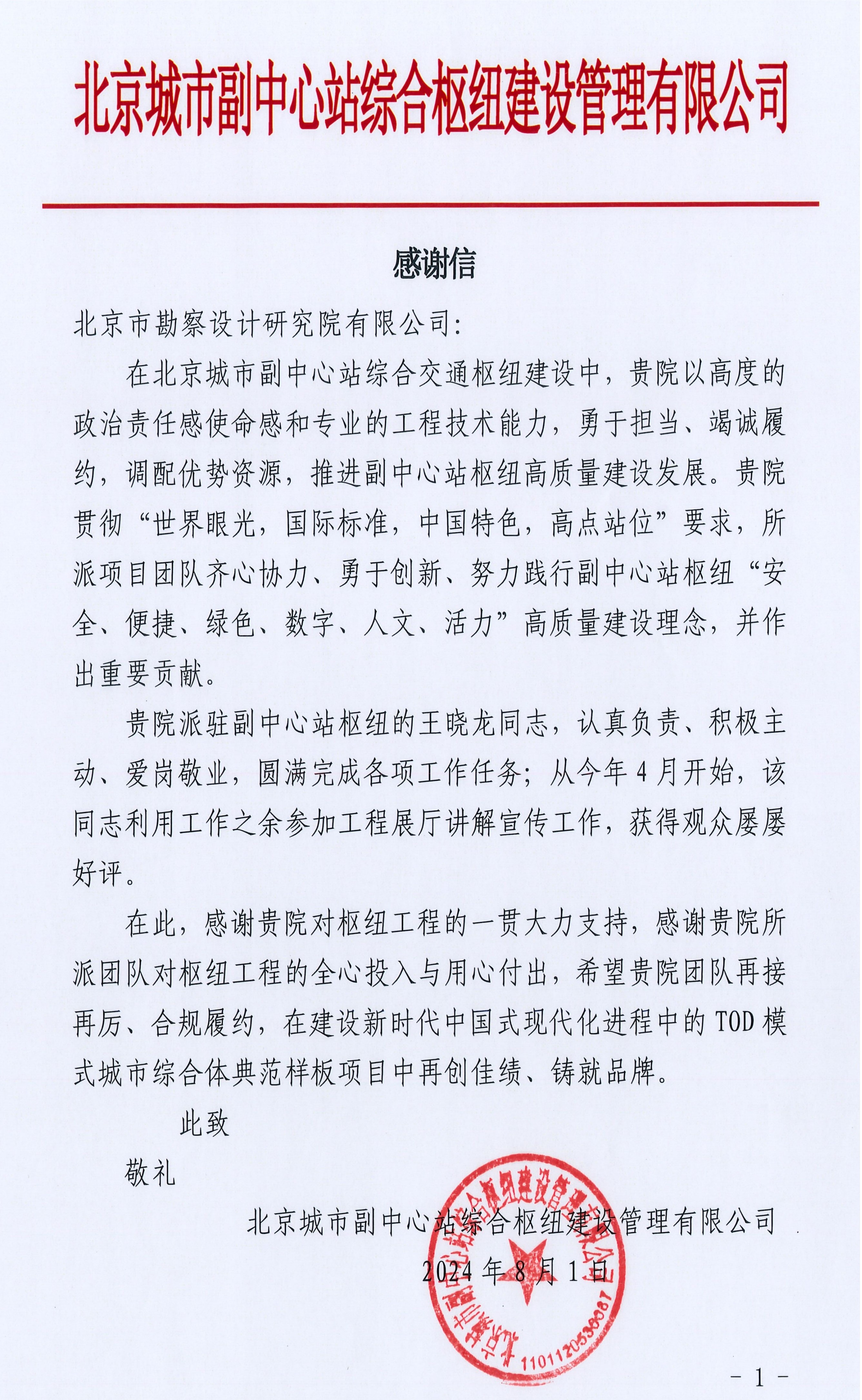北京城市副中心站綜合樞紐建設(shè)管理有限公司送來感謝信