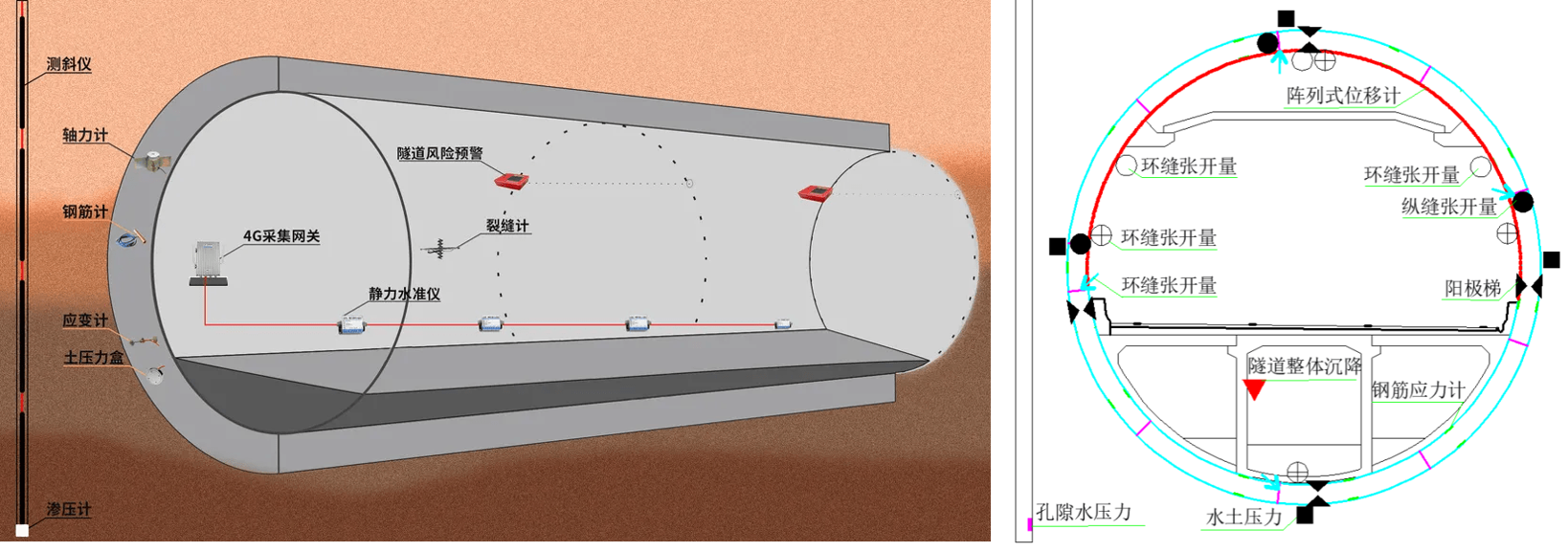 北勘監測團隊負責人介紹,本項目為超大直徑、超深埋深的盾構長距離穿越富水軟弱地層,先后穿越55處重大風險源,安全風險管控難度極高。北勘院針對工程實施特點,預先在隧道內“穿戴”了1300余個結構變形位移、荷載內力及結構耐久性等自動化監測傳感器,包括北勘院自主研發的陣列式位移計、壓差式靜力水準儀及自組網網關和節點硬件設備等,實現了對結構變形、受力、鋼筋腐蝕等隧道健康關鍵信息的實時、高效、智慧感知,保障了高風險環境條件下隧道的安全。